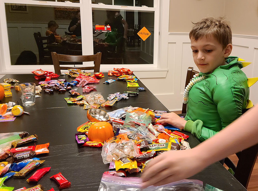 Candy negotiations in full swing in my house after one Halloween. You can see that some kids love to sort and count their candy obsessively, while others are happy with just a big ol’ pile.